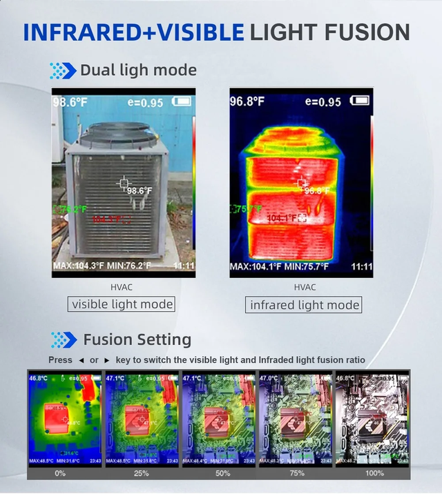 - Режими подвійного дисплея: Інфрачервоний режим і видимого світла, співвідношення злиття можна регулювати вручну (0%, 25%, 50% 75%, 100%), що дозволяє вільно керувати візуальними ефектами.
